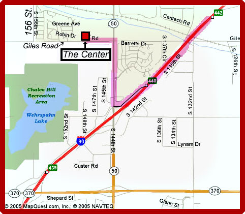 Take I-80 exit 440 and go North on HWY 50/144th Street.  Turn West on Giles Road and the Center will be on the North side of the road about a block west of 144th Street.
